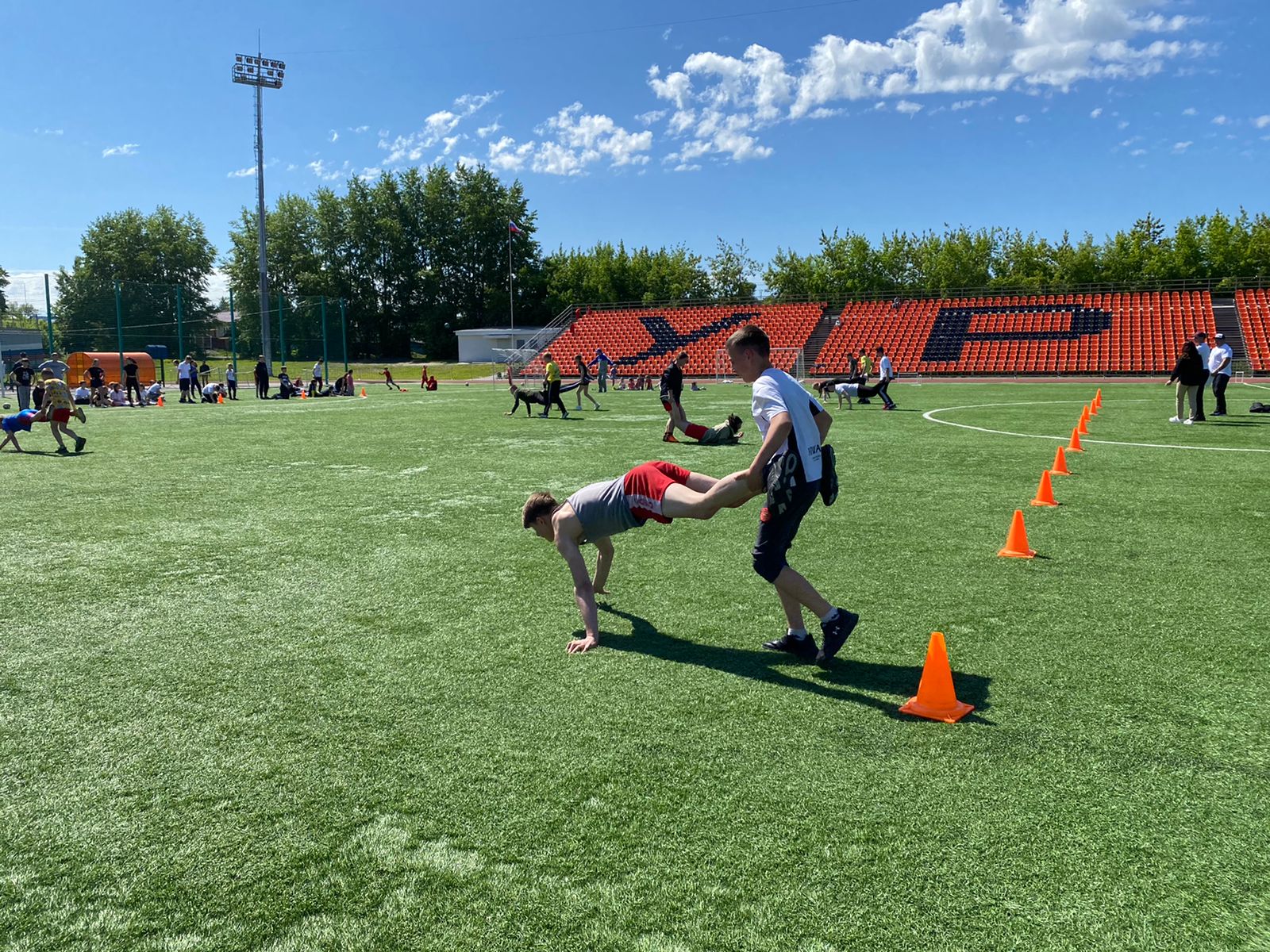 Соревновательная зона располагалась на футбольном поле с искусственным травяным покрытием. Ребята выполняли задания на развитие скоростных, скоростно-силовых, координационных, силовых качеств.
