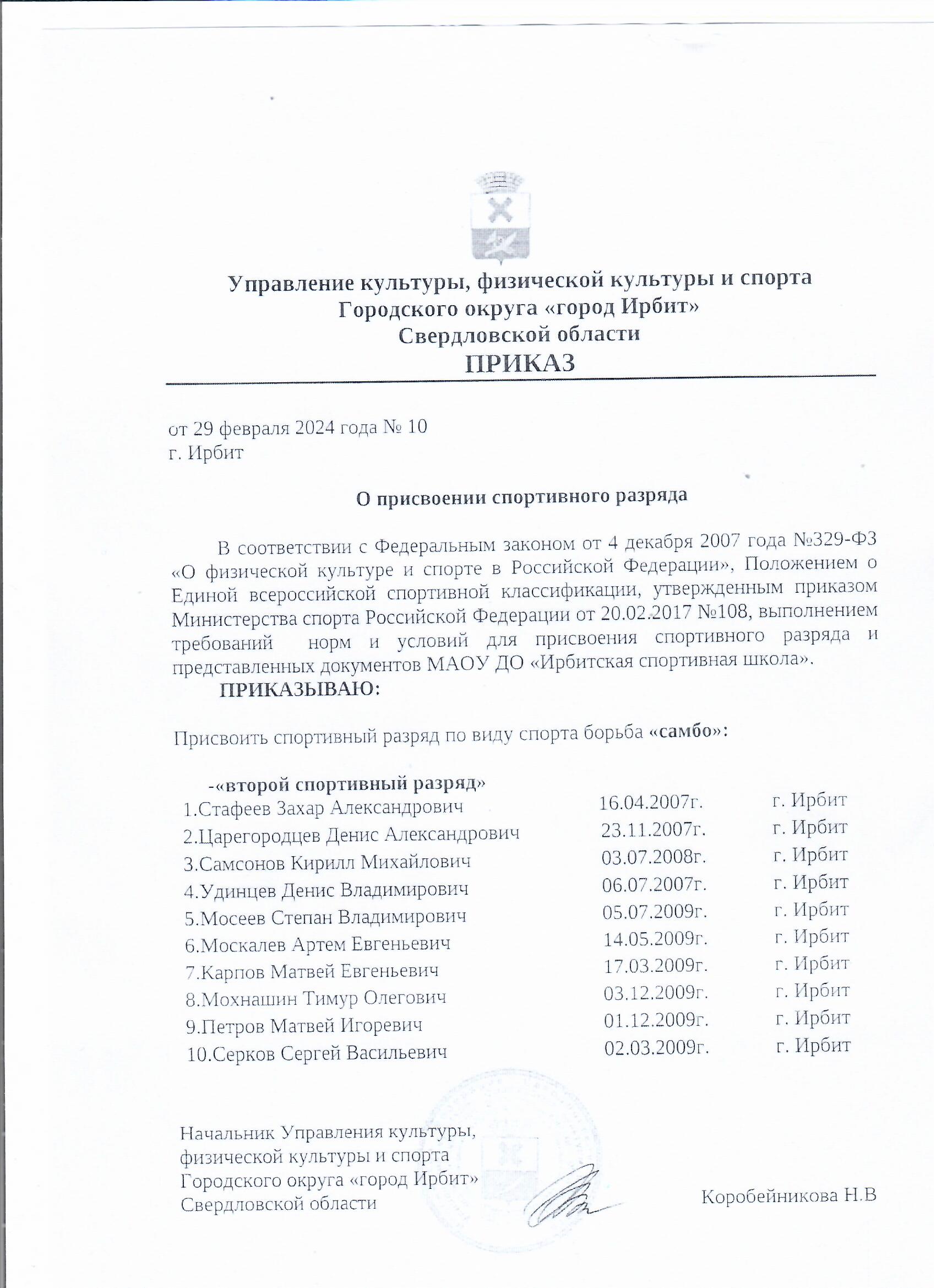 Приказ о присвоении спортивного разряда от 29.02.2024 № 10